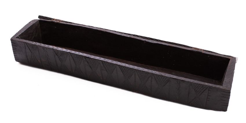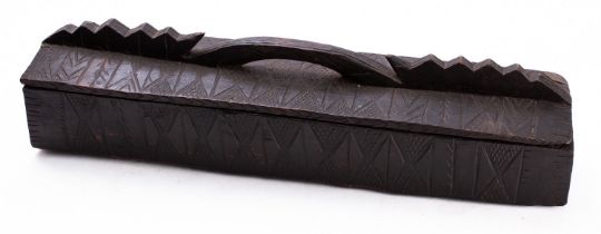 A carved and stained wood box, possibly Polynesian, early 20th century; of rectangular form, the cover with an arching handle rising between serrated ridges; with chip carved geometric decoration to top and sides; 14cm high, 61cm long