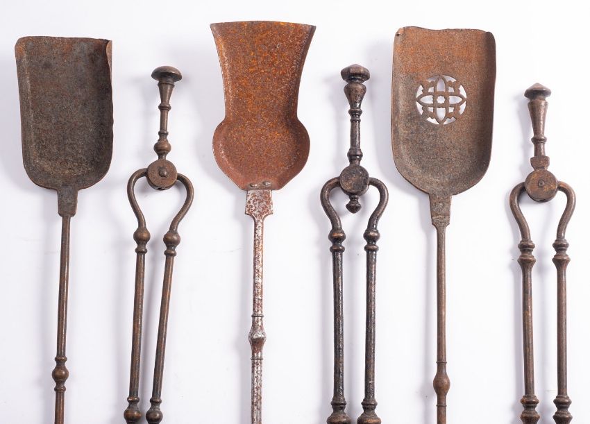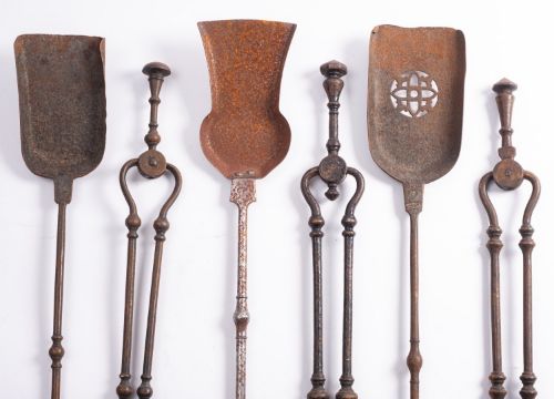 A group of 19th century fire irons, comprising a Regency shovel and tongs set, with mushroom grip finials and knopped shafts, 78cm; and two other shovel and tongs sets, these latter examples associated to each other