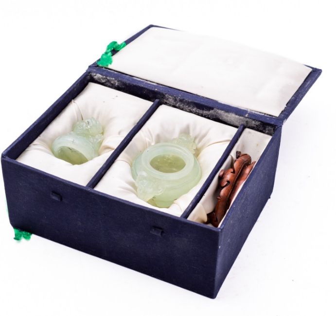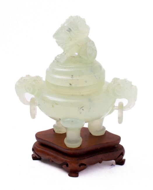 A Chinese carved green hardstone tripod censer and cover with mythical beast finial and loose-ring handles, 12cm high with wood stand and fitted box.