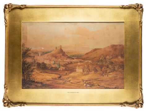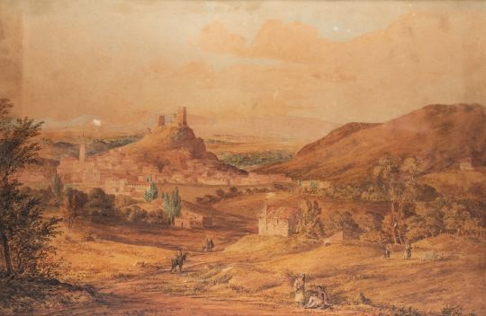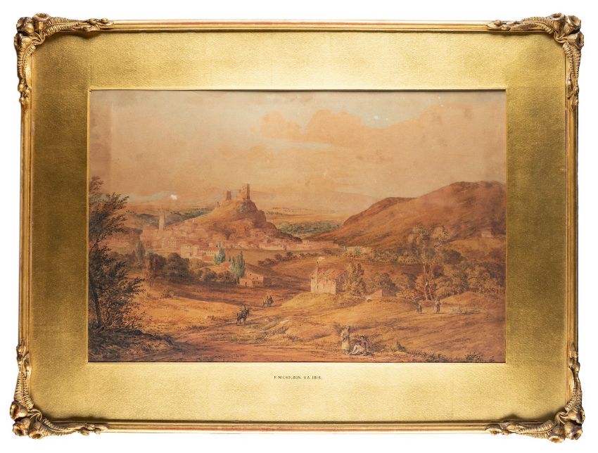Francis Nicholson (British, 1753-1844) - View of a fortified town in a landscape with figures - Watercolour - 36.5 x 55cm - Signed lower centre and dated 1816.