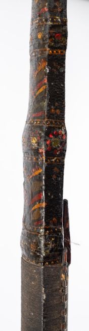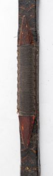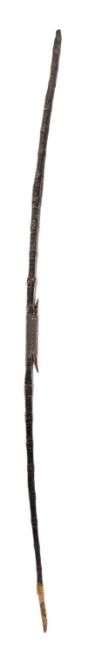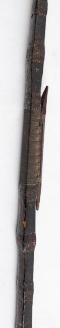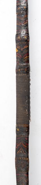 A painted and lacquered wood longbow, perhaps South East Asian, 19th century; the tapering form with spaced fabric banding beneath the decoration; the centre with a shaped and twine held grip; 152cm long