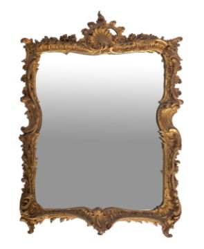 A gilt composition framed rectangular wall mirror in Rococo taste, last quarter 20th century; the surround with scrolling foliate and rocaille mouldings throughout; 67cm high, 48cm wide