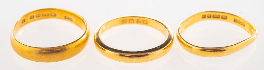 Three 22ct gold bands, including a 22ct gold wedding band, UK hallmark, size M to M1/2, 4.2grams; a 22ct gold wedding band, (bent out of shape), UK hallmark, 3.8grams; and a 22ct gold wedding band, (bent out of shape, UK hallmark, 2.1grams; total gross weight of all three bands 10.1grams, (3).