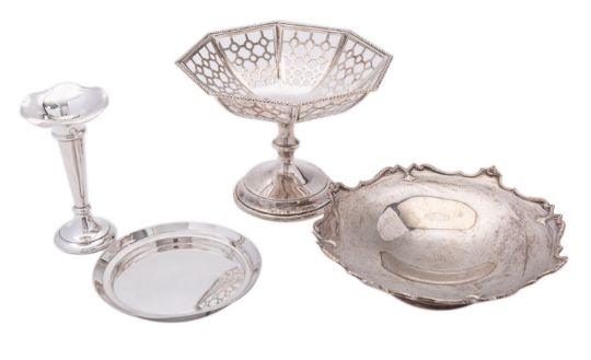A mixed group of silver including; George VI low tazza by Walker & Hall, Sheffield 1937, a tall tazza by Synyer & Beddoes, Birmingham 1944, a circular silver dish by William Hutton & Sons, London 1886 and a small trumpet vase with loaded base, 445.1gms., (14.3ozs.), gross, (4)
