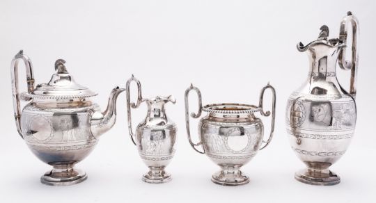 A Victorian four piece silver plated tea service by Roberts & Belk Ltd, Sheffield, model number 1421, in the Neoclassical Revival style, comprising a tea pot, hotwater jug, milk jug and sugar bowl, the hot water jug and tea pot with Greek helmet finial's, high C scroll handles with ivory insulator, hot water jug 33cm. (12.9ins.) high, (4)Ivory Registration number: Tea pot TG76PP12, Hot water pot 6UF25ElF