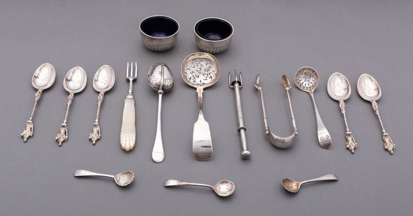 A mixed group of silver including; a George Gray patent tea infusing spoon, a pair of Victorian open salts with two spoons and two blue glass liners, a Victorian casting spoon, a small George III casting spoon, a set of five Victorian Apostle tea spoons, two pickle forks, a pair of sugar tongs and a salt spoon, 258gms. (8.3ozs.), gross, (13)