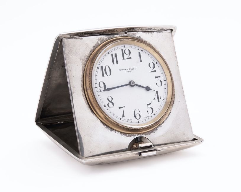 A George V silver cased travel clock by Mappin & Webb, Birmingham 1913, of square form, the convex hinged case opens to reveal a large circular dial with Arabic numerals, Swiss made, 9cm (3.5ins.), 330gms. (10.6ozs.), gross with watch