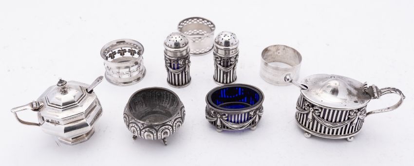 A mixed group of silver including; a four piece cruet set comprising of a mustard pot, two pepperettes and a salt, each with blue glass liners by E S Barnsley & Co, Birmingham 1915, with a octagonal mustard pot, London, with three napkin rings and a Dutch cauldron salt with Sheffield import marks, 260gms., (8.3ozs.), gross, (9)