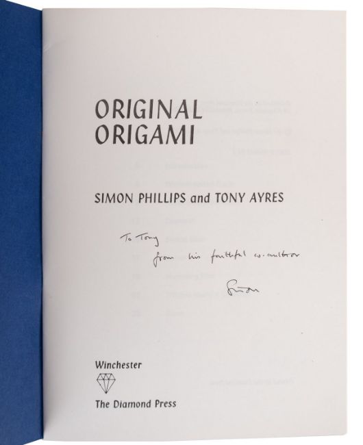 PHILLIPS, Simon, and AYRES, Tony. Original Origami, 1st edition, Winchester: The Diamond Press 1974, signed and inscribed 'To Tony from his faithful co-author Simon', orig. blue wraps with silver lettering, fine, 22cm x 15.5cm.