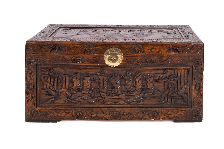 A Chinese carved and stained hardwood, probably camphorwood, coffer, 20th Century; the hinged top and front with sailing junks off the shore in relief within foliate borders, the ends with conforming reliefs; 47cm high, 100cm wide, 51cm deep.