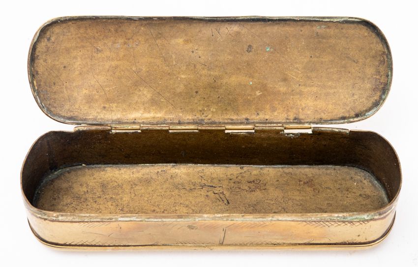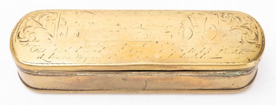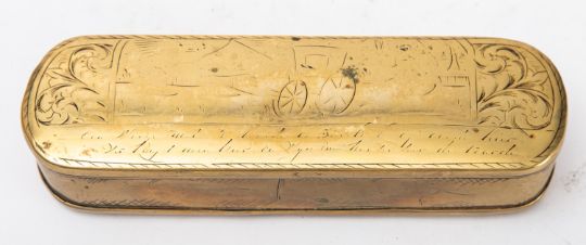A Dutch brass tobacco box, late 18th century; of rectangular form with rounded ends; the hinged cover and underside engraved with coaching scenes above text; further engraved detail to front and back; 3cm high, 17cm wide; (rubbed overall)