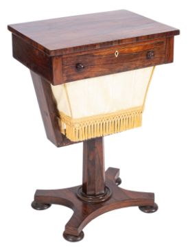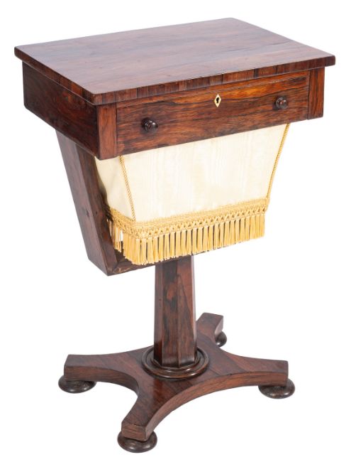 A Regency rosewood work table, early 19th century; the drawer with twin turned knob handles, opening with the integral tasselled fabric basket; the octagonal section shaft descending to a quatreform base with disc feet; 71cm high, 48cm wide, 35cm deep