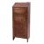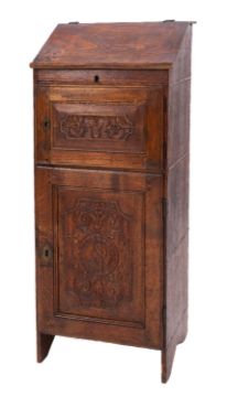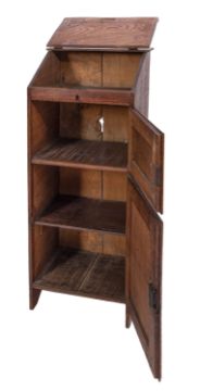 An oak and elm lectern cabinet, late 19th Century; with hinged and sloped top above two cupboard doors, with scrolling foliate panels and a Romayne in relief; the sides notched at the bottom to form legs; 109cm high, 45cm wide, 37cm deep.