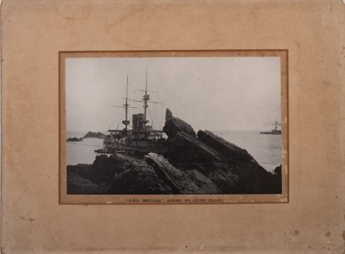 A 19th century sepia photograph of the crew of the SS 'Lovaine' of North Shields, Henry McCauley Commander, taken November 16th,1882, Erie Basin Brooklyn, New York, Hall & Co photographer, 10x15cm, together with a photograph of HMS 'Montague' ashore on Lundy Island, a photograph of HMS 'Malta'