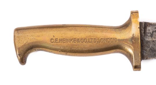 An early 20th Century brass and steel knife, maker C E Heinke & Co Ltd. the double edged blade with one edge serrated and the other straight, brass handle and sheath with leather strap, maker's stamp to handle, 33cm long.