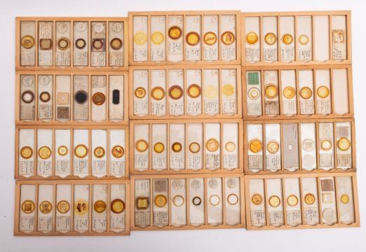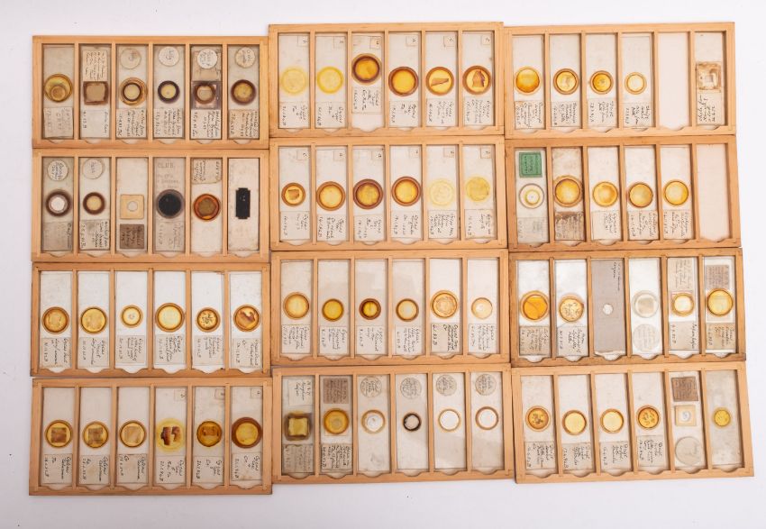 Ten cases of 20th Century mainly botanical microscope slides. The specimens comprise a range of flora including tree and plant life, small insects including spiders legs and claws all in wooden cases.