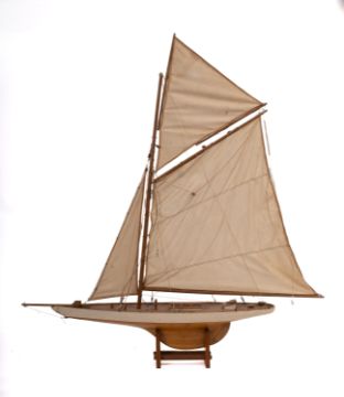 A 20th Century gaff rigged pond yacht. Fully rigged over simulated plank deck with deck house and fittings, wooden plank pinned hull painted white to the waterline with wooden keel on stand, 96cm high, 88cm long, 15cm wide.