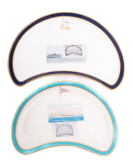 A Royal Worcester side plate for the steam yacht 'Doris', white with cyan and gilt border, maker's stamp to reverse, 22cm wide, together with a Royal Worcester side plate for the steam yacht 'Iolanda', white with dark blue and gilt border, maker's stamp to reverse, 25cm wide (2)