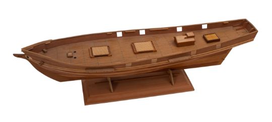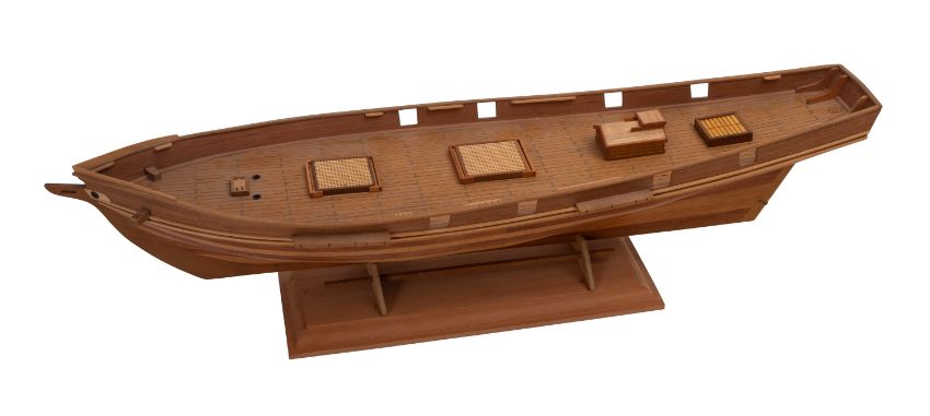 A scratch built plank and pin wooden hull. Having wooden deck fittings and set on a wooden stand, 15cm high, 68cm long, 17cm.