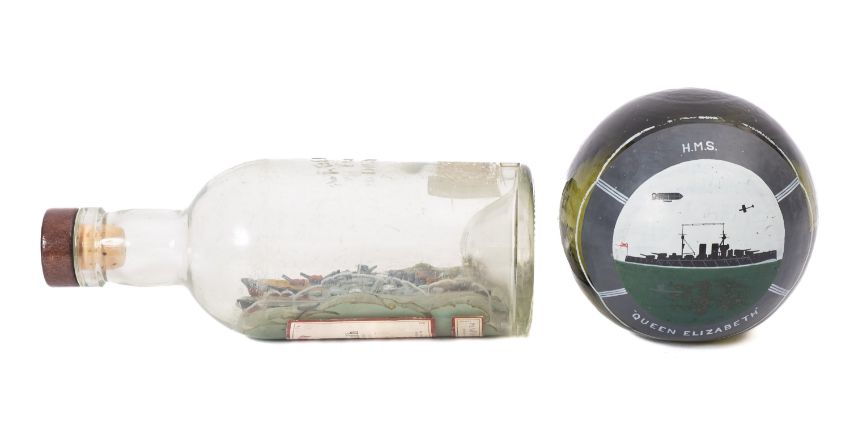An early 20th Century glass float decorated with a scene of HMS 'Queen Elizabeth'. Of spherical form, the scene showing the ship with spotting balloon and biplane above, together with models of two WWI ships in a bottle.