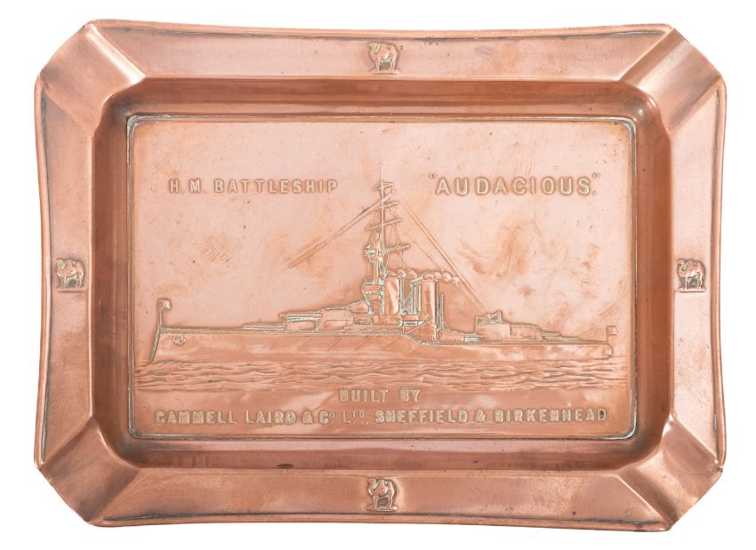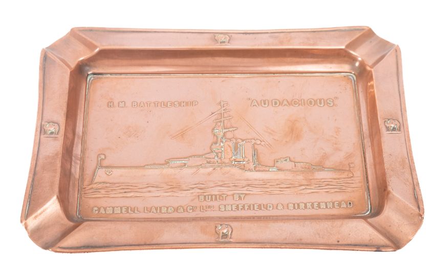 A copper launch commemorative ashtray for the Royal Navy King George V-class battleship HMS 'Audacious', 13.3x18cm