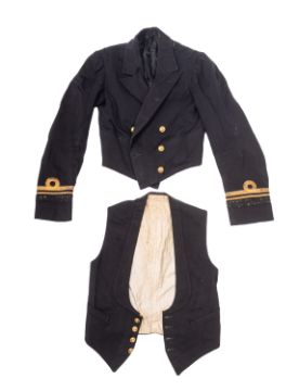 Three 20th Century Royal Navy uniform jackets. All in blue with brass buttons together with two conforming waistcoats and six pairs of trousers.