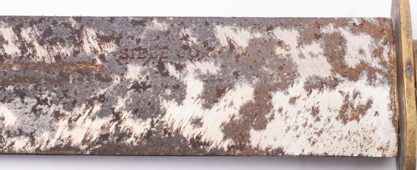 A 20th century diver's knife by Siebe Gorman & Co, the flat double-edged blade signed as per title over brass hilt and ribbed wooden handle, in a brass scabbard with black leather frog.