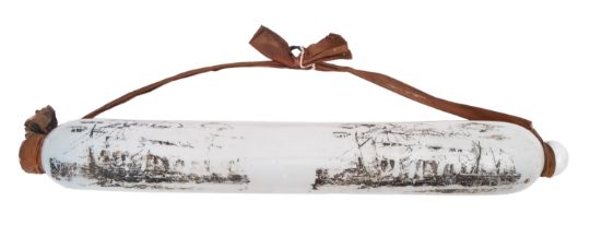 A 19th century opaque glass rolling pin transfer printed with sailing ships, length 62 cm