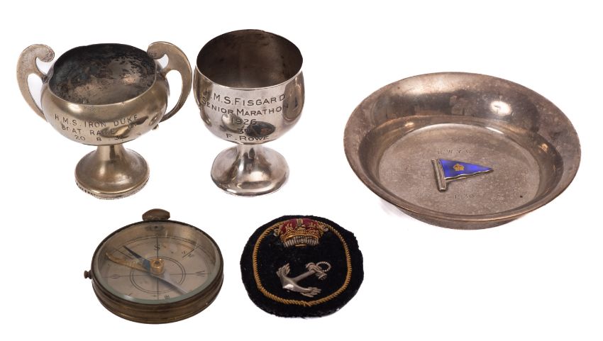 A George V circular silver and enamel Royal Western Yacht Club pin tray, maker William Base & Sons, Birmingham, 1929, 9cm diameter , together with an HMS 'Fisgard' silver marathon trophy, a silver plate HMS 'Iron Duke' rowing trophy, a pocket compass and a cloth patch. (5)