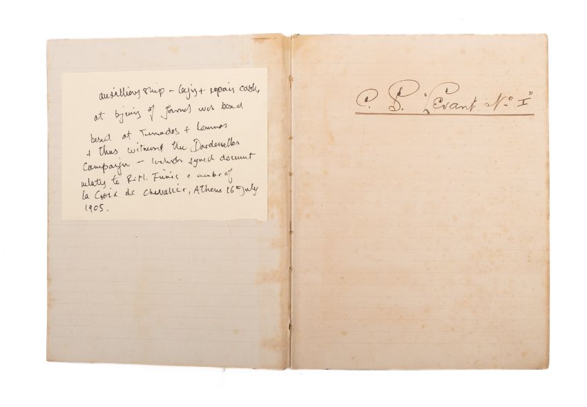 A WWI period ship's journal for the Cable Ship 'Levant I', circa 1915, with manuscript entries of daily activities operating in the straits of the Dardanelles, including coming under fire from Turkish Guns on Friday 26th February, together with related ephemera.