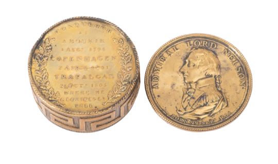 A 19th century pressed brass Admiral Nelson commemorative box, with portrait to the lid engraved 'Admiral Lord Nelson', Greek key border and inscribed base, diameter 5.4 cm