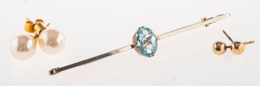 A small group of jewellery, including a bar brooch, claw set with an oval-cut aquamarine, aquamarine measuring approx. 8.2mm x 6.0mm x 3.5mm, marked 9C 18W, length approx. 5.8cm, 2.8grams; a pair of cultured pearl stud earrings, pearls approx. 7.5mm, earrings unmarked, butterflies marked 9ct, 1.8grams; and a pair of small ball studs, no butterflies, unmarked yellow metal, 0.0grams, (3).