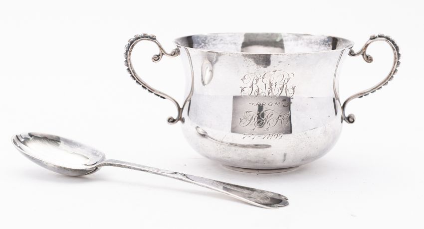 A Victorian silver christening porringer and spoon by Wakely & Wheeler, London 1898, of bulbous form, engraved presentation inscription, with matching Dog Nose spoon, 170gms., (6ozs.), gross, (2)