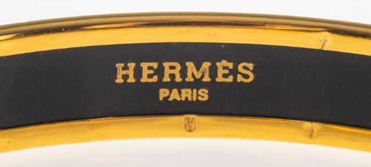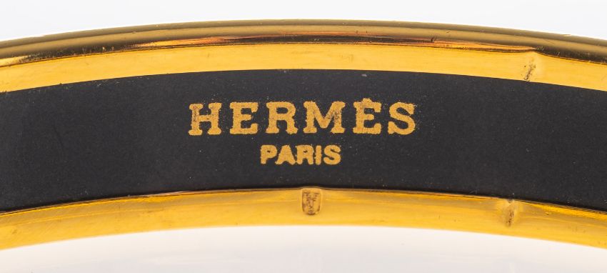 Hermes. A Hermes enamel rabbit bangle, a gold tone bangle with an enamel rabbit design all the way around the outside, marked inside Hermes, Paris, a small Foreign control mark, made in Austria +A, inner diameter approx. 6.5cm, 22.3grams. (Note: there is no paperwork or gift boxes with this item).