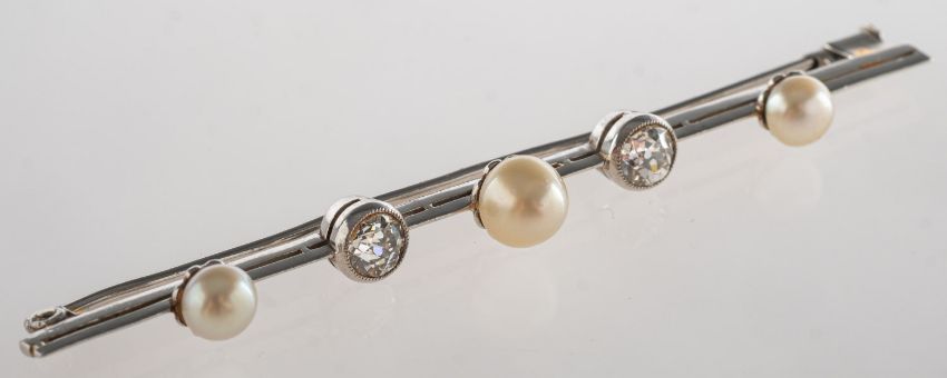A diamond and pearl bar brooch, milgrain set with two old-cut diamonds, diamonds approx. 0.80 carat total, (measured within the restrictions of their settings), with a central cultured pearl, approx. 6,5mm and set each end with a button pearl, pin and safety catch fitting, unmarked white metal, length approx. 7.5cm, 8.3grams.