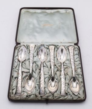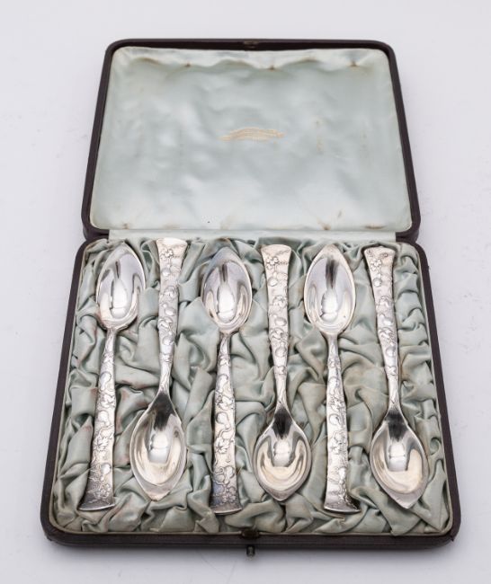 A cased set of six Vine pattern pointed grape fruit spoons by Tiffany & Co, London and New York 1873-1891, stamped 'M' for Edward Moore period, marked on the bowl import marks London 1902, Albert William Feavearyear, in a fitted leather and silk lined case, Tiffany & Co, 221 Regent Street W., London, 15.3cm, (6ins.) long, 191.6gms., (6.1ozs.), gross,(6)