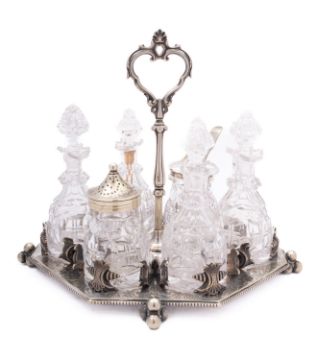 A Victorian silver plated six bottle cruet set by Padley, Parkin & Staniforth, Sheffield (1846-1875), with registration mark, diamond shaped base set on four stacked canon ball feet, 31x28cm., (12.2x11ins.)