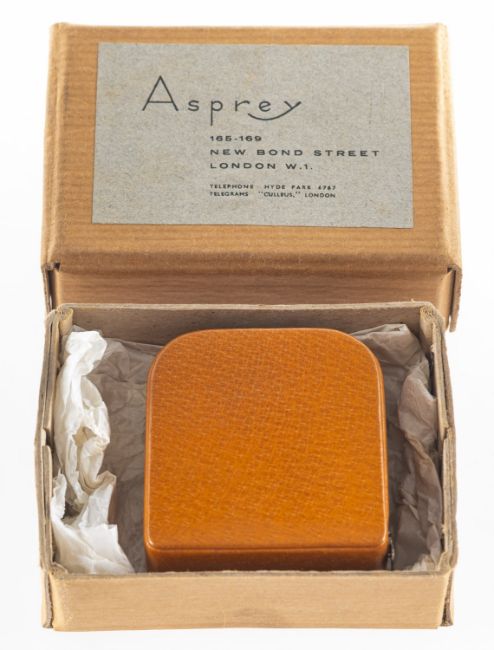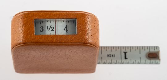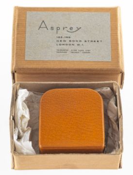 Asprey. An Asprey London leather cased tape measure, indistinct gold lettering to case 'Asprey London', measuring approx. 5.5cm x 5.0cm; accompanied by an Asprey marked cardboard box.