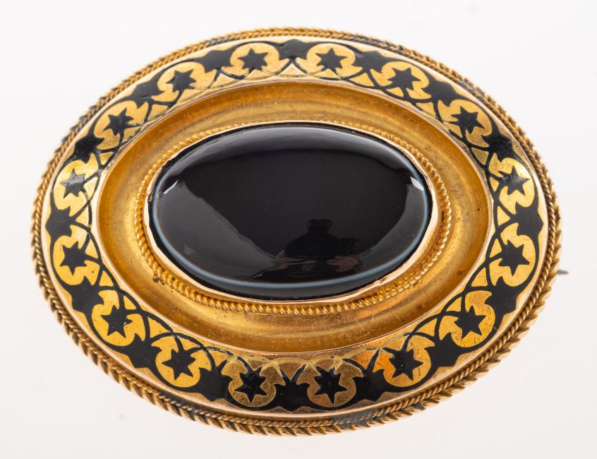 A group of two brooches, including a Victorian gilt and enamel mourning brooch set to the centre with an oval banded agate cabochon, coil of hair to verso under a clear panel, metal pin, length approx. 3.9cm, 12.7grams; and a cameo brooch pendant, bale marked 'rolled gold', length approx. 3.0cm, (not inc. bale), 6.3grams, (2).