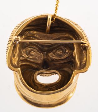 A gilt 'Greek' mask brooch of a bearded gentleman, indistinct markings to verso, safety chain, length approx. 4.0cm, 37.3grams.