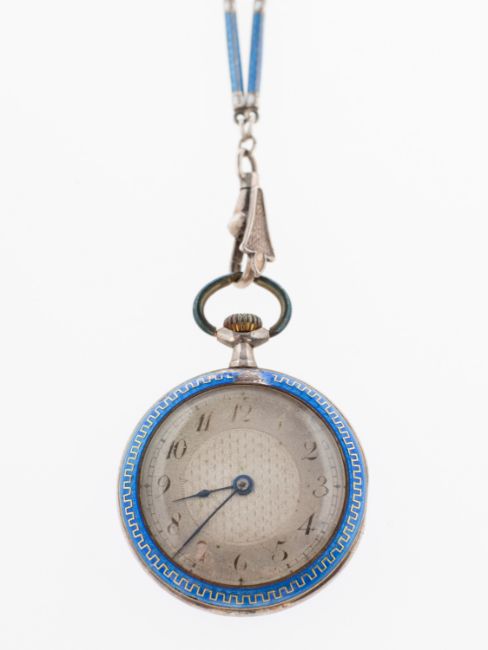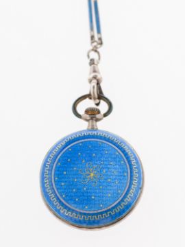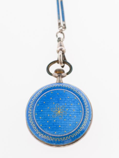 An early 20th century blue guilloche fob watch and chain, the watch with silvered engine turned dial and stylised numerals with an ornateblue guilloche and pique decorated case; the chain of links interspaced with blue and white guilloche bars to an ornate swivel clasp, bolt ring closure, unmarked silver metal, diameter of watch approx. 2.8cm, length of chain approx. 46.0cm, total gross weight 26.3grams.