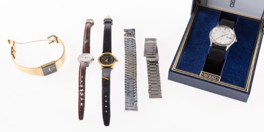A group of ten various watches to include:Omega Seamaster quartz a 9K gold wristwatch the dial having raised baton numerals, baton hands, date aperture and signed Omega Seamaster, Quartz, the movement stamped with the calibre number 1342, the case hallmarked for 9K gold, London 1979 and numbered 965102, diameter 34mm, gross weight 37.73gs.Cyma, Triplex a stainless steel wristwatch the round pin-striped silvered dial having raised Roman and baton numerals, Dauphine hands ,sweep seconds hand and signed Cyma, Triplex, Cymaflex, diameter 33mm. Complete with original sales receipt from Scott Cooper, Cheltenham dated 8/12/1954 for 17/15.Waltham, a stainless-steel wristwatch the round dial having luminous Arabic numerals, luminous hands, a subsidiary seconds dial and signed Waltham, the movement having a lever escapement and stamped 6/0 42, Waltham, 30950 932, the round case stamped within Keystone, 655729, diameter 30mm.Smiths Astral a stainless-steel wristwatch the round dial having raised baton and Roman numerals, baton hands, a sweep seconds hand and signed Smiths Astral, National 17, with a black leather strap, diameter 32mm.Seiko, a stainless-steel gentleman's wristwatch the round silvered dial having raised baton numerals, baton hands, day and date apertures, a sweep seconds hand and signed Seiko, Quartz, SQ, with box, paperwork and guarantee dated July 1986, serial number 080664 and case number 82237100, diameter 32mm.Smiths, a gold-plated wristwatch the dial having raised block numerals, a sweep seconds hand and signed Smiths, Jewelled Lever, with integral bracelet, diameter 34mm.Along with four further dress watches signed for Montine, Lorus, Labarre and Seiko.