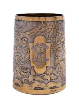 A Victorian Aesthetic Movement parcel silver-gilt mug probably by William Hutton and Son, London 1877, straight sided cylindrical form, with bamboo handle, the body chased and engraved with swallows amongst foliate branches, engraved monogram, 9.9cm, (3.8ins) high, 177.8gms., (5.7ozs.)