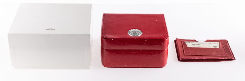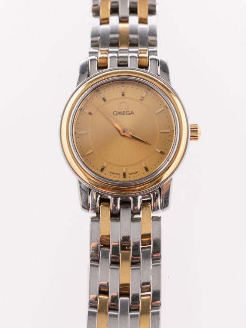 Omega a lady's wristwatch with boxes and paperwork the round dial having raised baton numerals, Dauphine hands and signed Omega, Swiss Made, the round stainless-steel case with gold bezel, the rear stamped Omega, 57643437, with inner and outer boxes, operating instructions and International Guarantee dated February 2003, showing the reference 43701100 and watch number 57643437, with matching integral bracelet, diameter 22mm.