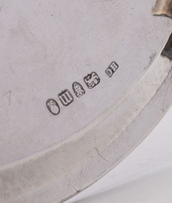 A George III silver tea pot stand by Henry Chawner, London 1787, of oval form, raised on four bracket feet, Bright cut border, the central cartouche with engraved crest, supported by scrolled ribbons and crossing bows below, 17.4cm, (6.8ins.) wide, 137.2gms. (4.8ozs.)