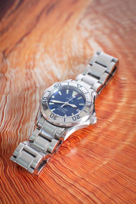 Omega Seamaster a lady's stainless steel wristwatch complete with boxes and paperwork the blue wavy dial signed Omega Seamaster Professional 300m/1000ft, Swiss Made, with raised luminous baton numerals, dauphine hands, sweep seconds hand and date aperture, with a rotating bezel, with the Seamaster logo embossed to the back, with a stainless-steel bracelet, diameter 28mm.Complete with inner cream box, tied with a red ribbon, inner red suede pouch and outer card box, with a red leather wallet containing the International Warranty and owner's card giving the calibre number 1414, reference number 22858000, watch number 58478282 and date of purchase as January 2004, along with various booklets.