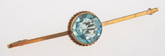 A blue topaz set brooch and a chain, a bar brooch set with a circular-cut blue topaz in a rope twist mount, gilt pin, indistinct mark 9ct? to verso, length 5.5cm, 3.8grams; and a fancy curb link chain, UK import mark for 375 to clasp fitting, swivel clasp (possibly a replacement), length approx. 72.0cm, 26.7grams.