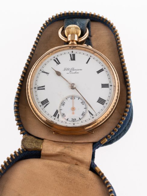 J W Benson a 9ct gold open-faced pocket watch the white enamel dial having black Roman numerals, a subsidiary seconds dial, gold spade hands and signed J.W. Benson, London, with the three-quarter plate movement having a lever escapement and signed J.W. Benson, 62 & 74 Ludgate Hill, London, The New 'Ludgate', Best London Make, 8186, the case stamped within J.W.B., 4556, and hallmarked for 9ct gold, London 1936, diameter: 50mm, gross weight c.74.32gs.