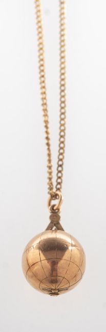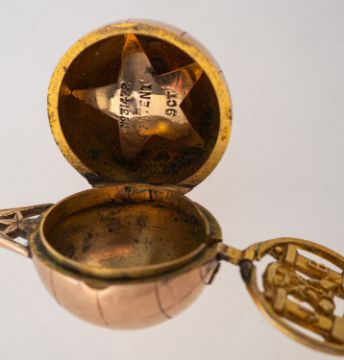 A Masonic ball pendant with chain, the Masonic ball is hinged and opens to one side, revealing an articulated 'ladder' of four gilt circular openwork Masonic symbols which fold back into one side of the ball, inside the other half of the ball is a fixed star symbol which is engraved 'No. 31472 Patent 9ct', the outside of the ball is marked 9ct and there is an openwork Masonic symbol to the top, length approx. 3.2cm, 6.9grams; accompanied by a gilt chain.