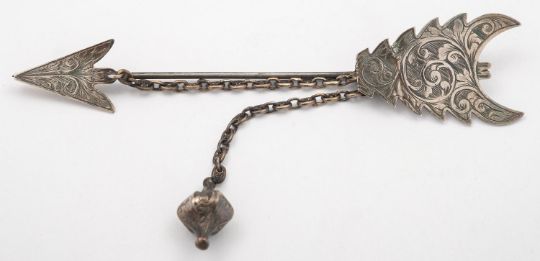 A Victorian silver kilt/shawl pin by Henry Ellis & Co, Exeter, 1847, engraved maker's mark and "Combmartin Silver"arrow shape, with engraved detail and attached white metal safety chain, 11cm long,12.6 gms. (0.4ozs), grossHenry Ellis (d.1871) opened his first shop on Exeter's High Street in 1814. A watchmaker by trade, Ellis retailed goods made locally and in Birmingham and London. In 1847 his eldest son, Henry Samuel, registered the firm's design for 'Patent Safety Chain Brooches', some of which were made from silver mined at Comb Martin on Exmoor. After the purchase of five brooches by Queen Victoria, Ellis & Son were appointed Silversmiths in Ordinary to the Queen in 1848 and exhibited at the Great Exhibition in 1851."